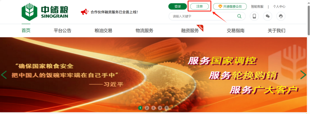 ①在网站上搜索“中储粮网”或在地址栏输入 https://www.esinograin.com/ —— 点击【注册】