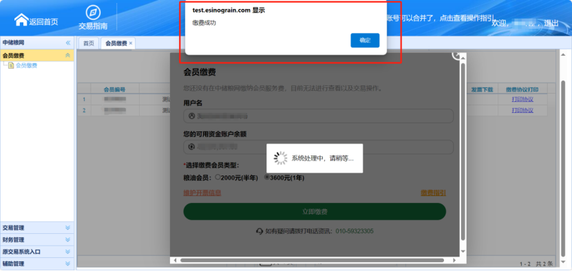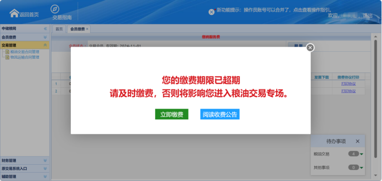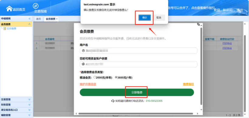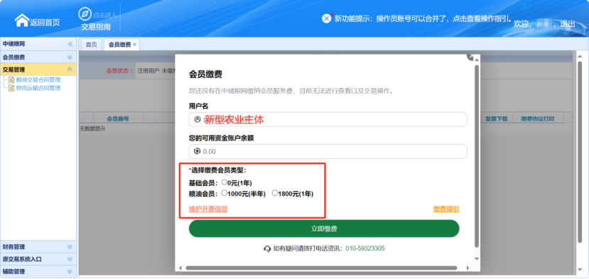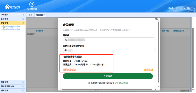 1.登录财务账号(C开头的账号)——点击页面提示弹窗的【立即缴费】按钮或者点击左侧【会员缴费】模块,进入缴费页面