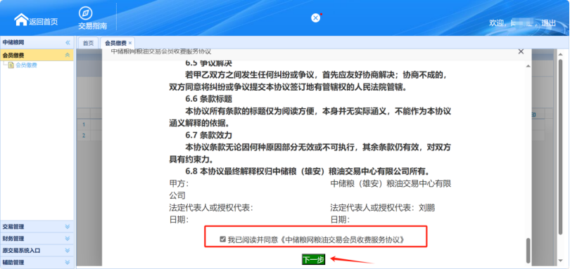 2.点击【缴纳服务费】,仔细阅读收费服务协议并勾选同意后,点击【下一步】