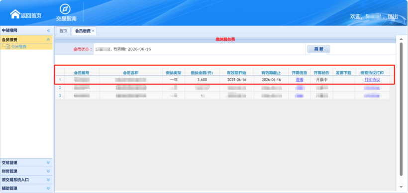 5.返回【会员缴费】模块可查看缴费有效期及服务协议,开票完成后可下载发票