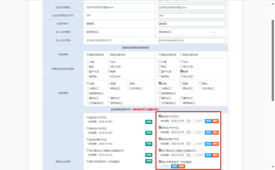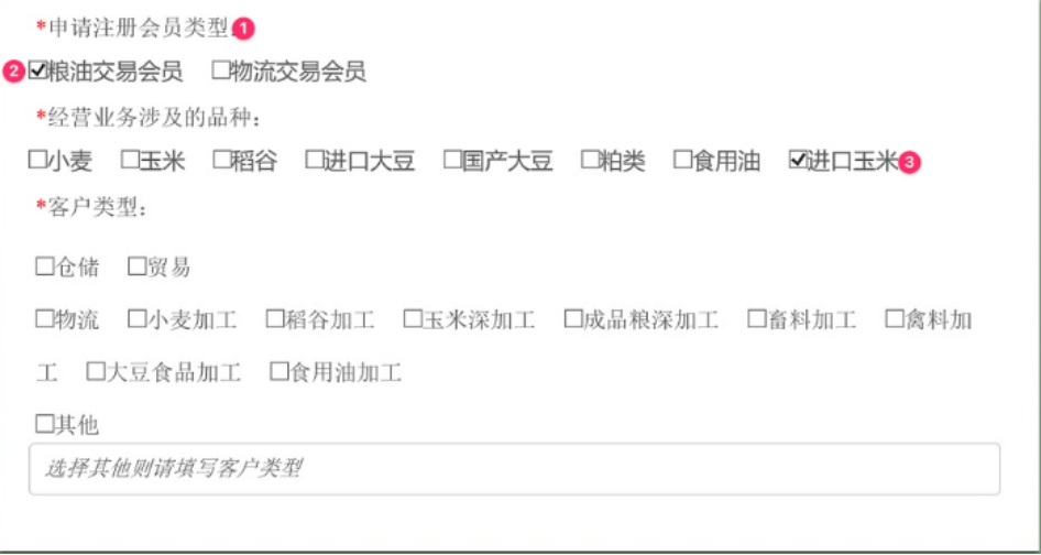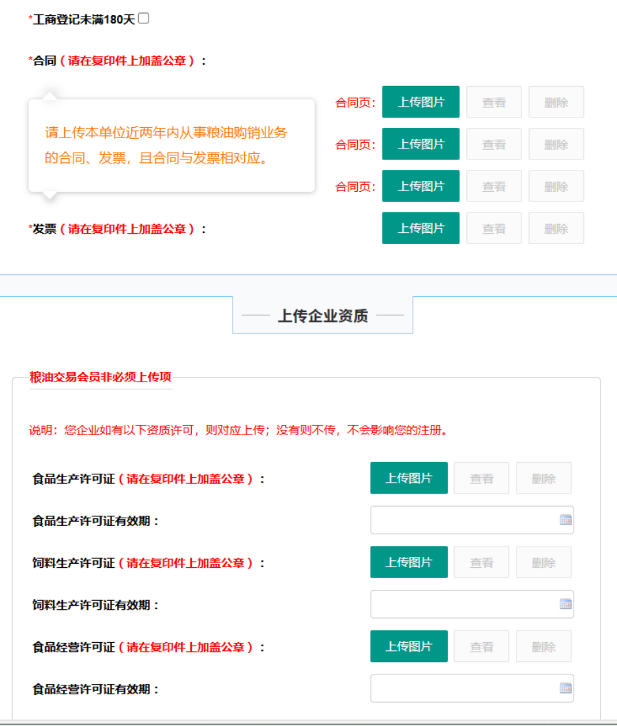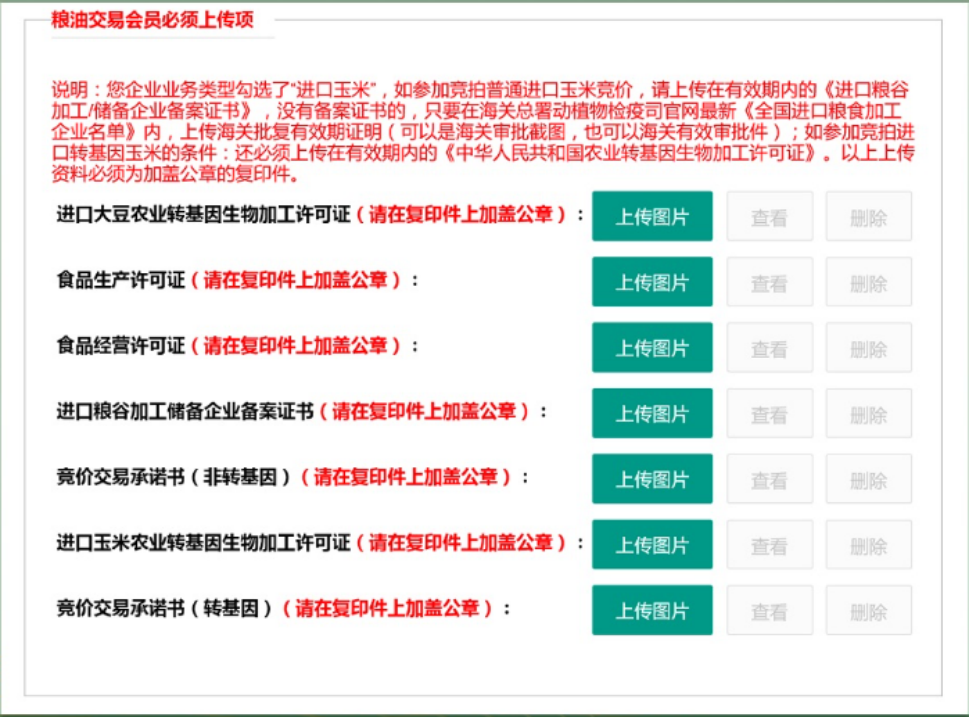 2.注册页面中【会员类型】选择【粮油交易会员】,【品种】中勾选【进口玉米】,按提示上传对应证照资质材料。