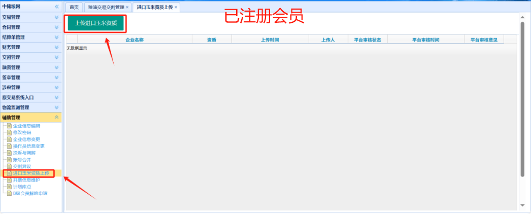 1.交易账号(0开头账号)登录中储粮网,点击左侧【辅助管理】,点击【进口玉米资质上传】,点击【上传进口玉米资质】。