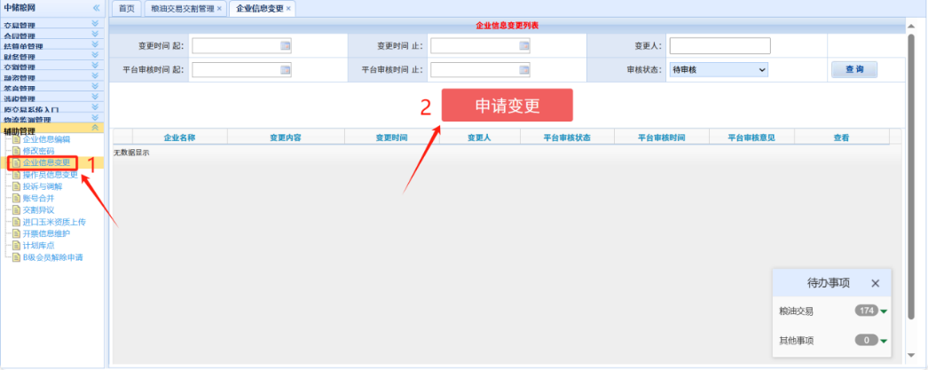 合同变更只能从中储粮网发起,不可以从合同审批系统里发起,申请合同变更双方同意后,系统自动将合同传入审批系统中,直属库提交审批流程,等审批结束后,将审批数据传输至中储粮网。