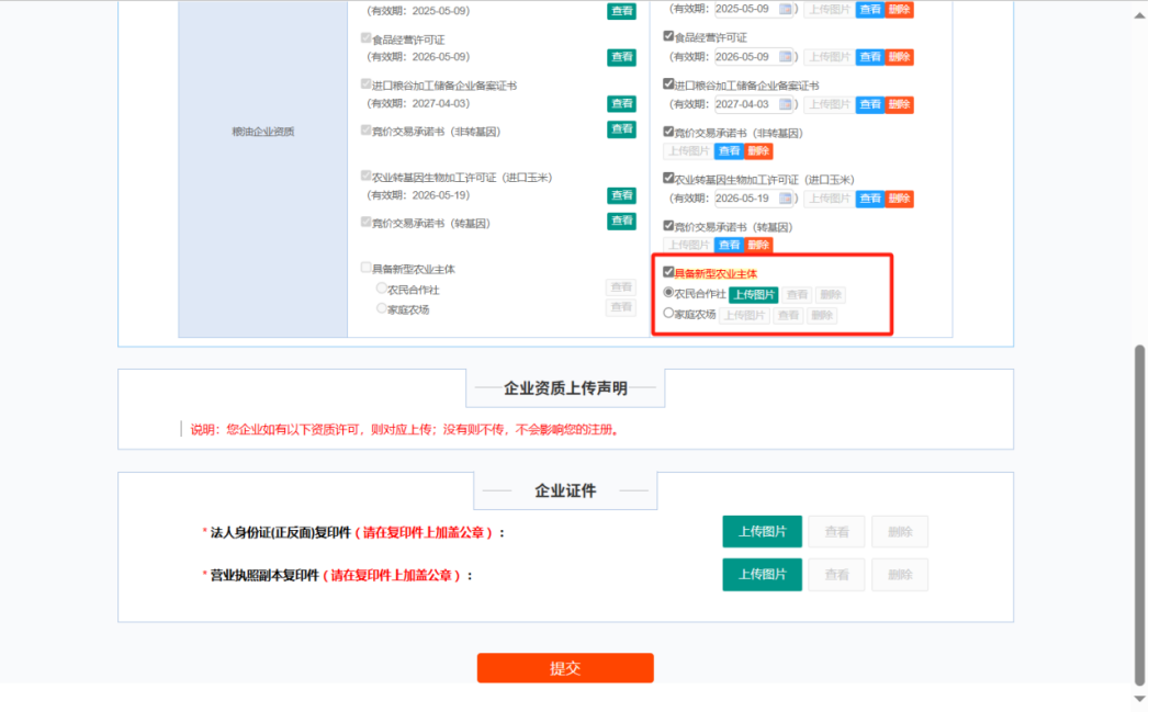 1.首页左侧【辅助管理】选择【企业信息变更】,【申请变更】中选择【具备新型农业主体】,按提示上传对应证照资质材料。