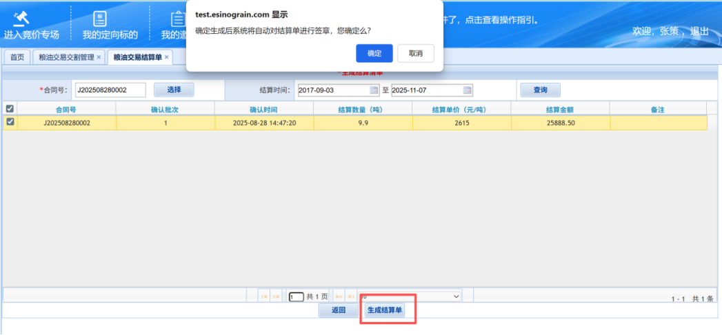 ⑤弹出结算单确认页面——点击【确认】,完成结算单的确认,确认通过后系统会对结算单自动盖章”