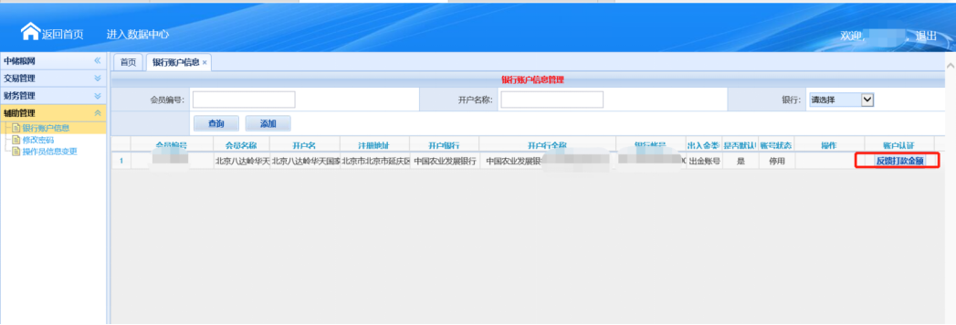 ②登录财务账号(即c开头的会员账号)——进入【辅助管理】——【银行账户信息】——点击【反馈打款金额】。